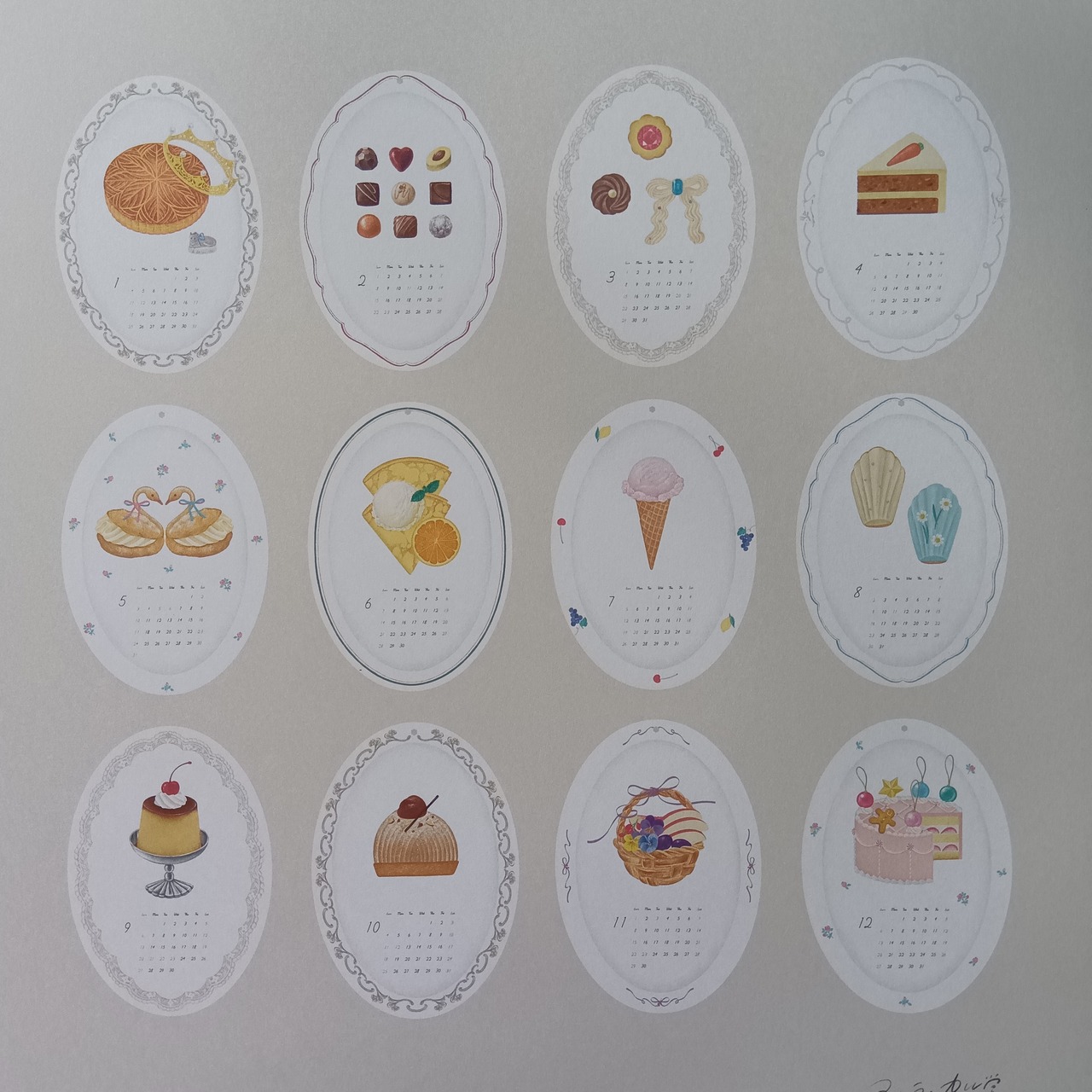 毎月違ったお皿のデザインに焼き菓子やデザートが素敵に描かれたカレンダーです。